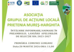 Vă așteptăm Vineri, 20.03.2026 începând cu ora 11.00 în sala de ședințe a Primăriei Gurghiu și începând cu ora 13.00 în sala de ședințe a Primăriei Solovăstru!